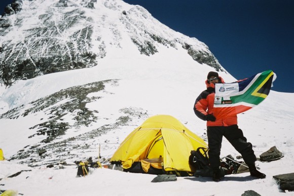 Jangbu Sherpa with Sponsors' flag at South Col (7850m), 23rd May 2006