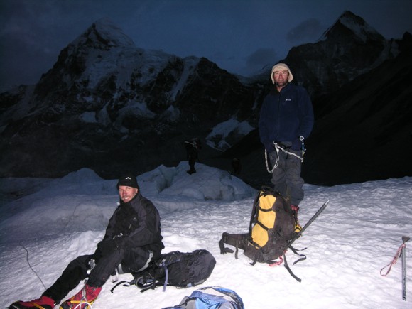 Vaughan and Sean on their way up the Khumbu Icefall before Sunrise on 17 April 2006 Top left is Mt Pumori whilst top right is the Lingtren1 peak